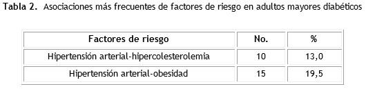 Las asociaciones más frecuentes entre factores de riesgo en los adultos mayores diabéticos fueron la HTA con obesidad para 19,5 % (tabla 2).