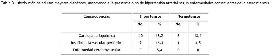 La distribución del adulto mayor diabético, atendiendo a la presencia o no de hipertensión arterial según enfermedades consecuentes de la aterosclerosis, se observa en la tabla 3, afectando a los pacientes hipertensos asociados a la cardiopatía isquémica en un 18,2 %, seguidos de un 16,4 % de insuficiencia vascular periférica.