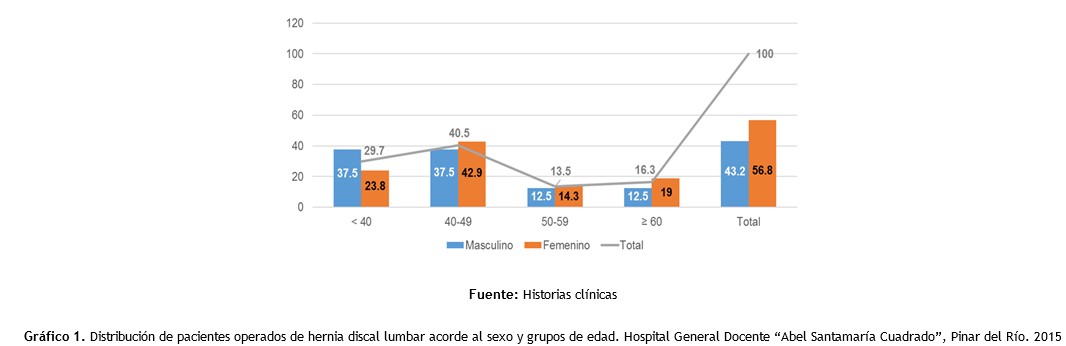 Method: an observational, descriptive and cross-sectional study was carried out in this institution during 2015, working with a target group of 37 patients operated on lumbar disc herniation. The information obtained from the medical records was processed using descriptive statistics techniques. Medical ethics was respected.