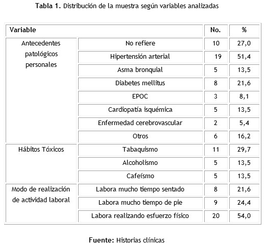 Se constató predominio de la hipertensión arterial como el principal antecedente patológico personal (51,4 %), siendo el tabaquismo el principal hábito tóxico (29,7 %), mientras predominaban los pacientes que laboraban ejerciendo un gran esfuerzo físico (54,0 %).