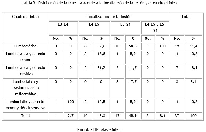 Acorde a la tabla 2, predominaron las lesiones localizadas a nivel de L5-S1 y L4-L5 (45, 9 y 43,3 % respectivamente), siendo la lumbociática la principal manifestación clínica (51,4 %). A nivel L3-L4 la lumbociática asociada al defecto motor y al déficit sensitivo estuvo presente en la totalidad de los pacientes con lesiones a este nivel, mientras la lumbociática pura predominó en las demás localizaciones (37,6; 58,8; 100 % para L4-L5, L5-S1 y L4-L5 combinada con L5-S1 respectivamente).