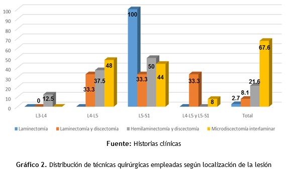 La mayoría de los pacientes fueron intervenidos mediante la microdiscectomía interlaminar (67,6 %), seguido de la hemilaminectomía y discectomía (21,6 %). La laminectomía fue empleada únicamente en las lesiones ubicadas a nivel de L5-S1; la laminectomía junto con discectomía se usó por igual en las lesiones a nivel de L4-L5, L5-S1, y L4-L5 y L5-S1 (33,3 % en todos los casos); el uso de la hemilaminectomía y disectomía predominó en las lesiones de L5-S1; mientras el uso de la microdiscectomía interlaminar predominó en la localización L4-L5 (48 %).