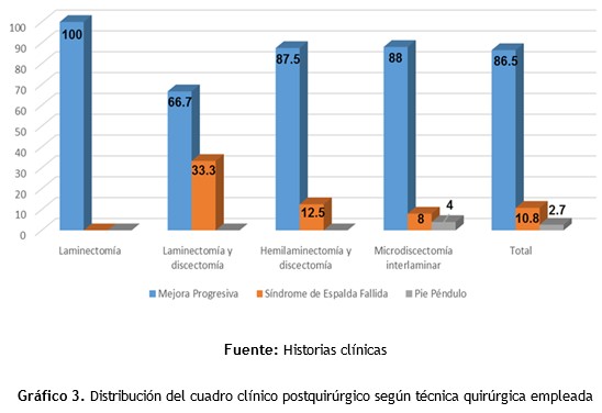 Se muestra un predominio de mejora progresiva (86,5 %) postquirúrgica en la mayoría de los pacientes. La técnica quirúrgica más efectiva fue la laminectomía, presentando el 100 % de los pacientes intervenidos, clínicamente una mejora progresiva. Se encontró predominio de casos de síndrome de espalda fallida (33,3 %) luego la realización de la laminectomía y discectomía, mientras para el pie péndulo lo fue la microdiscectomía interlaminar (4 %).