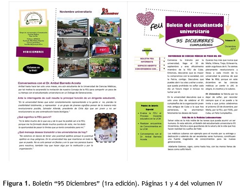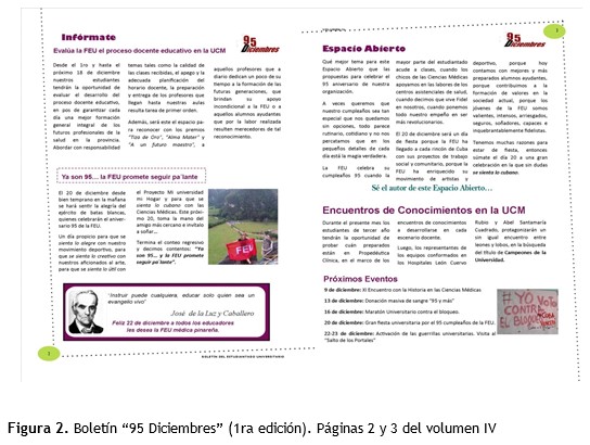 Página 1: en el borde superior se encuentra en posición horizontal el nombre del producto “95 Diciembres”, a la izquierda de este el logo de la campaña por el 95 aniversario de la FEU, y a la derecha el número de volumen correspondiente, mes y año. En el borde superior izquierdo se encuentra una tabla de contenido donde se muestran las secciones del producto; a la izquierda de esta tabla se encuentra el boletín del mes en curso donde se transmite el tema central de la edición. En el borde inferior izquierdo se encuentra un recuadro donde se colocan los elementos sobre los que se desea llamar la atención del estudiantado; a la derecha se ofrece información de interés especial sobre alguna actividad próxima a realizarse, acompañada de imágenes que le dan una visión más atractiva al mensaje (figura 1).