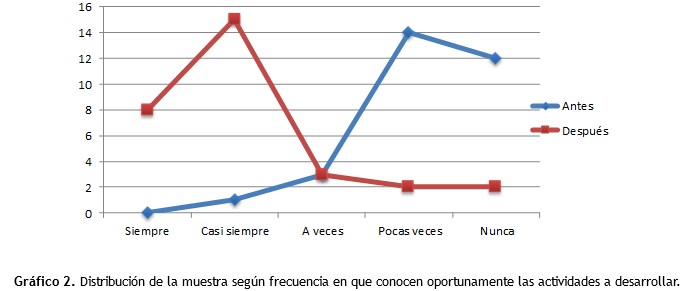 Gráfico 2. Distribución de la muestra según frecuencia en que conocen oportunamente las actividades a desarrollar.