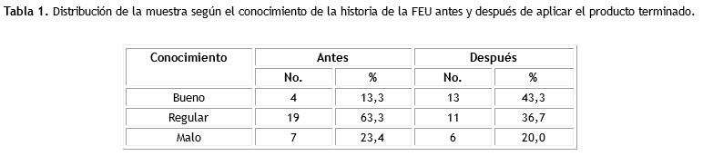 Tabla 1. Distribución de la muestra según el conocimiento de la historia de la FEU antes y después de aplicar el producto terminado.