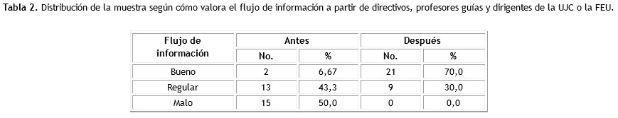 Tabla 2. Distribución de la muestra según cómo valora el flujo de información a partir de directivos, profesores guías y dirigentes de la UJC o la FEU.