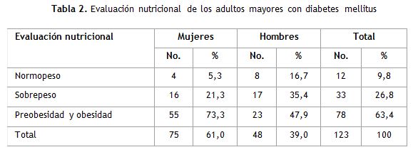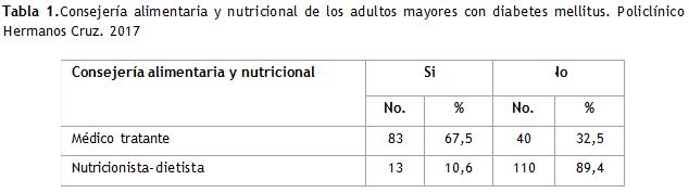 Method: an observational, descriptive cross-sectional study was conducted between July and December 2017 at Hermanos Cruz polyclinic. From a target group of 1782 older adults with diabetes mellitus, a sample of 123 was randomly selected. A survey was applied, giving nutritional and food counseling, assessing anthropometry data, and the evaluation of eating habits and blood glucose measurement were performed. Data processing was carried out with the SPSS software package version 21.0. Medical ethics approaches were respected.
