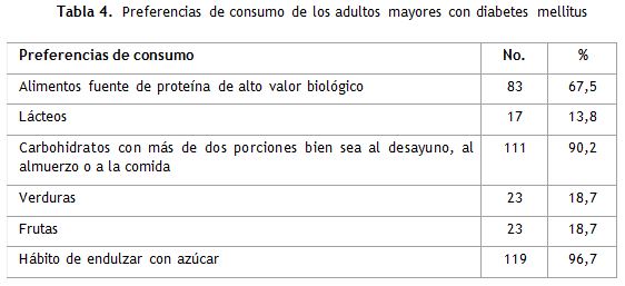En las preferencias de consumo (tabla 4) se destacan: ingesta alta de carbohidratos con más de dos porciones bien sea al desayuno, al almuerzo o a la comida en el 90,2 % de los casos; consumo diario de alimentos fuente de proteína de alto valor biológico en el 67,5 % de los casos; además se encontró el hábito de endulzar con azúcar en el 96,7 % de la muestra, siendo esto una proporción considerable de personas.