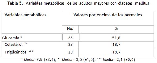 Las mediciones de glucemia y del perfil lipídico (solamente colesterol total, y triglicéridos) se observan en la tabla 5. Mostrando las cifras de glucemia en sangre obtenidas: sus valores estuvieron por encima de los aceptables en el 52,8 % de la muestra, observándose además que promediaron los valores medios de la muestra en 7,5 (±3,4) μmol/L; el colesterol total osciló en 3,5 (±1,5) μmol/L; los valores de triglicéridos fueron de 2,1 (±0,6) μmol/L.