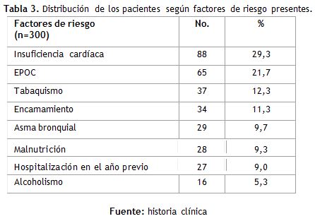 La tabla 2 muestra que 54 pacientes se encontraban expuestos a factores de riesgo de IRA para un 59,0 %. Hubo predominio del tabaquismo con un 14,1 %.
