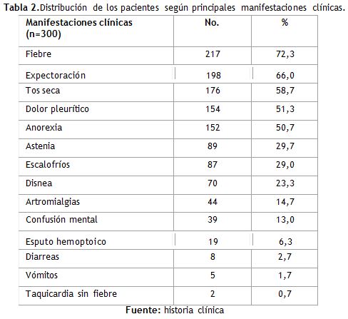 Results: the age group over 71 years old was the most affected (38,0 %), female sex (58,3 %). Fever outweighed as clinical sign (72,3 %), heart failure (29,3 %) as a risk factor and hypertension (82,3 %) as comorbidity. Decompensate heart failure (56,3 %) was the most frequent complication.