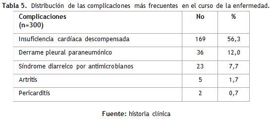 La complicación más frecuente fue la insuficiencia cardíaca descompensada (56,3 %) (tabla 5).