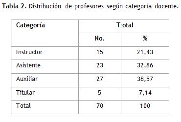 La categoría docente de los profesores con coautoría en los artículos que predominó fue la de profesor auxiliar con el 38,57 % (tabla 2).