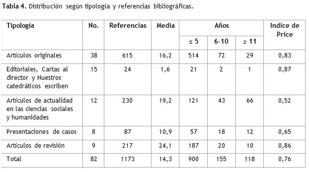 En este aspecto de las citas bibliográficas se considera que se debe ser cuidadoso en cuanto al nivel de actualidad de las referencias en los artículos originales. Valoraciones de estudios bibliométricos(17) afirman que estos generan un mayor número de accesos a partir del interés que suscitan en la comunidad científica por las características de las investigaciones y el valor que pueden aportar desde el punto de vista práctico.