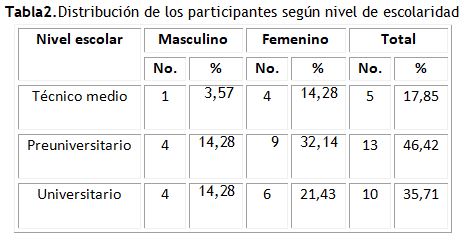 Se encontró predominio de participantes con nivel educacional preuniversitario (46,42 %).