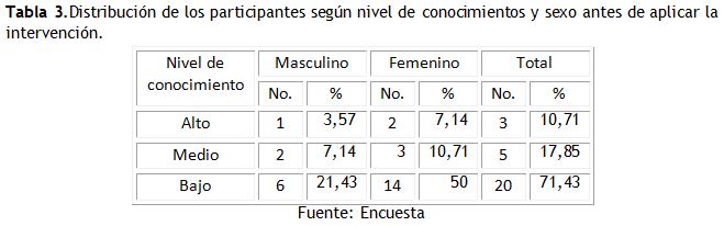 Al evaluar el nivel de conocimientos previo a la intervención se encontró que el 71,43 % de los participantes presentó un nivel bajo. No se encontró asociación entre el nivel de conocimientos y el sexo (tabla 3).