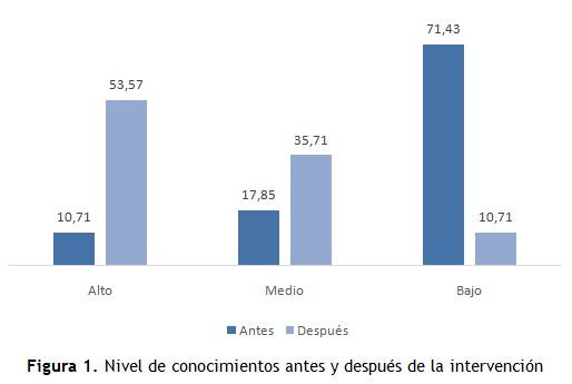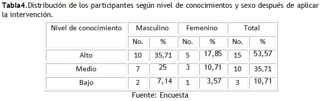 Después de la intervención se encontró que el 10,71 % de los participantes presentó un nivel de conocimientos bajo (tabla 4).