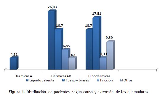 Se encontró que el 43,84 % de las lesiones fueron causadas por líquidos calientes, seguidas de las lesiones por fuego y brasas (31,51 %). Se encontró predominio de lesiones dérmicas AB (50,68 %) (figura 1).