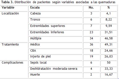 El 46,58 % de los pacientes recibió quemaduras de localización múltiple, y en el 49,31 % de los casos el tratamiento fue médico. La principal complicación fue la deshidratación (50 %) y solo fallecieron dos pacientes (tabla 3).