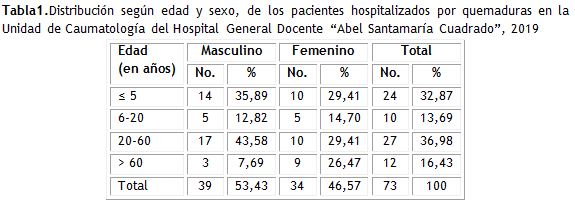 Method: observational, descriptive and cross-sectional study in patients hospitalized for burns in the Caumatology Unit at “Abel Santamaria Cuadrado” General Teaching Hospital during 2019. The target group included 110 patients and 73 in the sample.