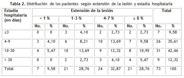 El 42,46 % de los pacientes estuvo hospitalizado entre 10 y 30 días, y en el 32,87 % de los casos la extensión de la lesión fue entre el 4 y 7 % de la superficie corporal (tabla 2).