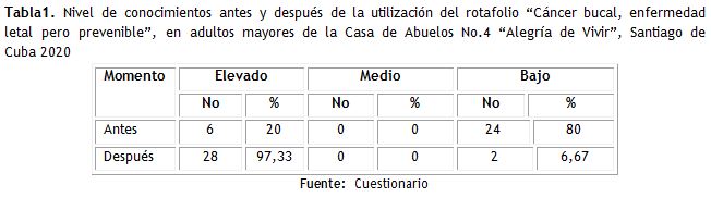Se probó la utilidad del rotafolio “Cáncer bucal, enfermedad letal pero prevenible”, con un grupo de adultos mayores pertenecientes al hogar de ancianos, logrando que aumentaran sus niveles de conocimientos respecto a la temática. Es este medio de enseñanza es un método novedoso de divulgar este tema de manera fácil y sencilla, y que pudiera ser diseminado a toda la población, pues a pesar de que el cáncer bucal es incidente en determinados grupos de edad, esto no exime a cualquier persona de tenerlo.
