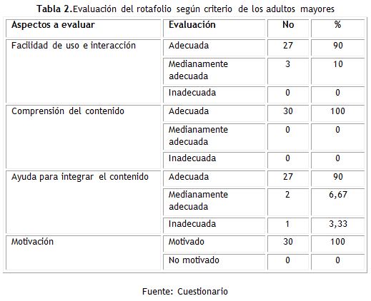 Resultados: previo a la aplicación del rotafolio, el 80 % de los encuestados presentó niveles inadecuados de conocimientos y tras la intervención, el 97,33 % presentó niveles adecuados. El 90 % de los adultos mayores identificaron como adecuada la facilidad de uso e interacción del producto y la ayuda para integrar el contenido; y el 100 % determinó como adecuada la comprensión del contenido. El 100 % se mostró motivado por el uso del producto. El 90 % de los especialistas determinó como alta la calidad del rotafolio y la calidad del contenido, mientras que el 100 % determinó como alta la calidad del diseño y su utilidad práctica.