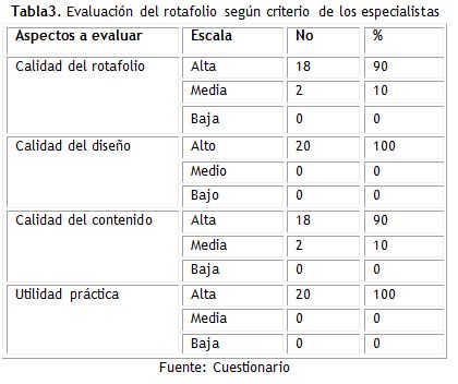 El 90 % de los especialistas determinó como alta la calidad del rotafolio y la calidad del contenido, mientras que el 100 % determinó como alta la calidad del diseño y su utilidad práctica (tabla 3).