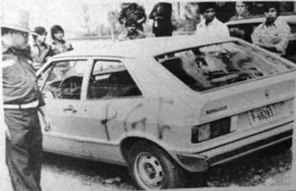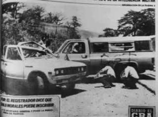 En este sentido, las fotografías que circularon en la prensa escrita participaron en la configuración de los militantes de la COMIL. Algunas de sus acciones fueron ampliamente difundidas, lo que aportó un corpus de imágenes que nos permiten interpretar las representaciones del chingamucero. El ejemplo de ello fue el ajusticiamiento del coronel Máximo Zepeda Martínez,48 realizado el 22 de marzo de 1980, donde también falleció su chofer, el agente Perfecto Aceituno Macal. En las fotografías de prensa se destacó la violencia de los hechos, y algunos medios utilizaron la imagen que focaliza al vehículo Pick up en el que se transportaba el coronel, resalta en una de sus puertas el rótulo: PGT, hecho con pintura en aerosol.49