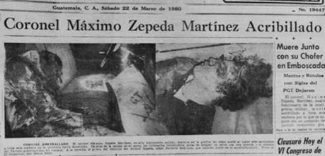 El encabezado del rotativo en el que se lee: "Coronel Máximo Zepeda Martínez Acribillado" ocupa seis de las ocho columnas, y el material gráfico en cinco columnas. Este material consta de dos fotografías que muestran los restos del excoronel y su acompañante. Para comprender estas imágenes es necesario revisar la tradición periodística del diario que tuvo su primer número el 16 de junio de 1922, a cargo de quien fuera su director, Alejandro Córdova;50 los jefes de redacción, César Brañas -Alfonso Alfaro- y Carlos Gándara Durán -Razamukin-; el jefe de información, Rafael Alvarado Tinoco; y el administrador, Antonio Gándara Durán. Se publicó en formato estándar, también llamado sábana o clásico -dimensión de 14x23 pulgadas de las cuales 13x21 pulgadas- 273 pulgadas cuadradas eran utilizadas para impresión.51