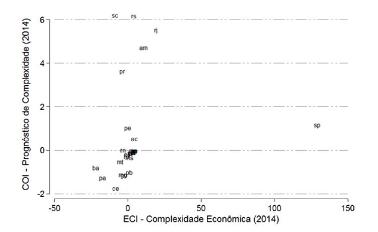 O Gráfico 1 compara os estados brasileiros a partir dos indicadores de complexidade (ECI) e de prognóstico de complexidade (COI), sendo o tamanho das siglas proporcional ao PIB nominal dos estados. Aqueles que apresentaram os maiores valores para o COI, em 2014, foram Santa Catarina, Rio Grande do Sul, Rio de Janeiro, Amazonas e Paraná. Esses resultados permitem dizer que a atual estrutura econômica desses estados encontra-se relativamente próxima de produtos complexos, quando comparada aos demais estados brasileiros. Para esses estados, o processo de sofisticação seria, portanto, relativamente mais fácil. Em contraste, aqueles que registraram indicadores de baixa complexidade econômica e baixo prognóstico de complexidade não somente possuem uma estrutura econômica pouco complexa, como também se encontram distantes de produtos sofisticados. Nesses casos, o desenvolvimento de capacidades produtivas mais sofisticadas requer volumosos investimentos.