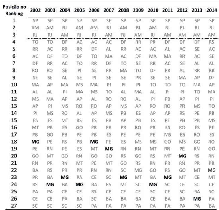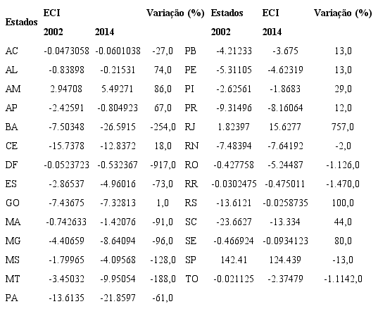 O Quadro 1 apresenta a posição dos estados brasileiros no ranking de complexidade econômica no período de 2002 a 2014, sendo o 1o lugar associado ao maior valor deste índice (ECI). A primeira posição é ocupada pelo estado de São Paulo que, embora tenha registrado perda de complexidade entre 2002 e 2014, alcançou ECI oito vezes maior que o Rio de Janeiro, segundo estado de maior complexidade econômica do país.