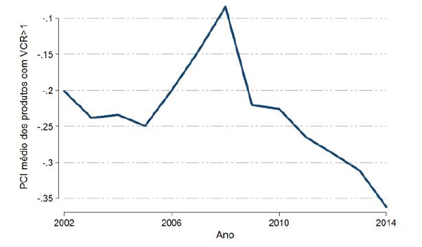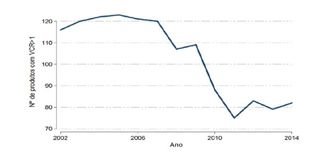 Os resultados indicam para Minas Gerais e outros onze estados brasileiros - Roraima, Bahia, Ceará, Paraíba, Pernambuco, Piauí, Distrito Federal, Goiás, Mato Grosso do Sul, Espírito Santo e Rio de Janeiro - redução das cestas de produtos com vantagem comparativa no período de 2002 a 2014 (considerando VCR >=1). Isso significa que tais estados sofreram maior concentração de suas exportações, ao reduzirem o número de produtos exportados com vantagem comparativa revelada. Contudo, a redução da cesta de exportação com vantagem comparativa não implica necessariamente a perda de complexidade econômica, já que esse índice também leva em consideração a complexidade dos produtos que compõem a cesta.