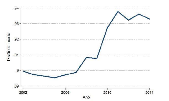 Outra forma de analisar a trajetória do product space de Minas Gerais é observar a evolução das distâncias médias dos produtos ao longo do tempo. A distância média agrega as distâncias de todos os produtos exportados por uma dada localidade em relação aos produtos em que essa localidade possui vantagem comparativa revelada. Quanto maior for a distância média, mais disperso tende a ser o product space e, consequentemente, mais difícil a possibilidade de acúmulo e compartilhamento de conhecimento produtivo entre diferentes atividades econômicas.