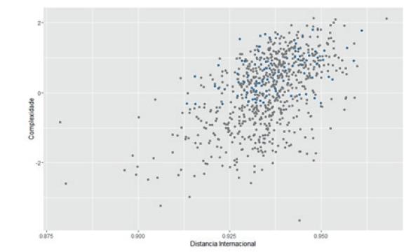 Por fim, o Gráfico 5 apresenta a distribuição dos produtos exportados por Minas Gerais, em 2014, a partir de suas medidas de complexidade e distância internacional. Observa-se que os produtos mais complexos da cesta de exportação mineira possuem os valores mais elevados de distância.
