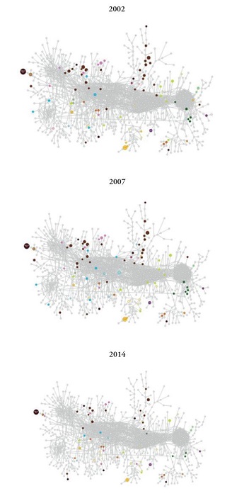 A perda de vantagem comparativa associada à perda de produtos complexos afeta diretamente a evolução do product space de Minas Gerais durante o período, o que é ilustrado na Figura 1, elaborada com base na plataforma Dataviva, considerando-se os anos 2002, 2007 e 2014. Ela retrata os produtos que Minas Gerais exportou com vantagem comparativa no ano específico (cada ponto colorido representa um setor econômico) e a rede de produtos (pontos e traços em cinza claro). Enquanto a rede de produtos tem seu formato definido pelas probabilidades de coexportação de um mesmo produto pelos países - independentemente dos valores exportados por Minas Gerais -, os pontos destacados representam especificamente as conexões existentes entre os produtos exportados por Minas Gerais com vantagem comparativa revelada.
