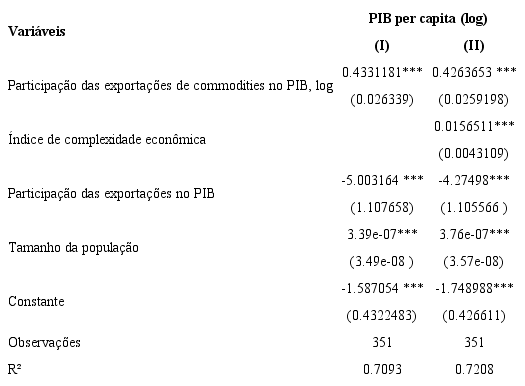 Observa-se que o índice de complexidade econômica dos estados apresentou coeficiente positivo e estatisticamente significante para explicar as diferenças observadas no nível de renda dos estados brasileiros e a inclusão desse indicador contribuiu para um ligeiro aumento do R2, de 70% para 72%.