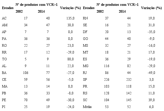 Demonstrada essa relação, as tabelas subsequentes voltam-se para a análise do comércio exterior, já que o aumento de complexidade do estado decorre do crescimento da participação de produtos complexos na sua cesta de exportação (com VCR). Entre 2002 e 2014, todos os estados brasileiros ampliaram o valor de suas exportações (MDIC, 2016). A ampliação do valor exportado, no entanto, não foi acompanhada pelo aumento da cesta de produtos exportados com vantagem comparativa revelada: a esse respeito, como mostrado na Tabela 1, os estados brasileiros apresentaram diferentes trajetórias.