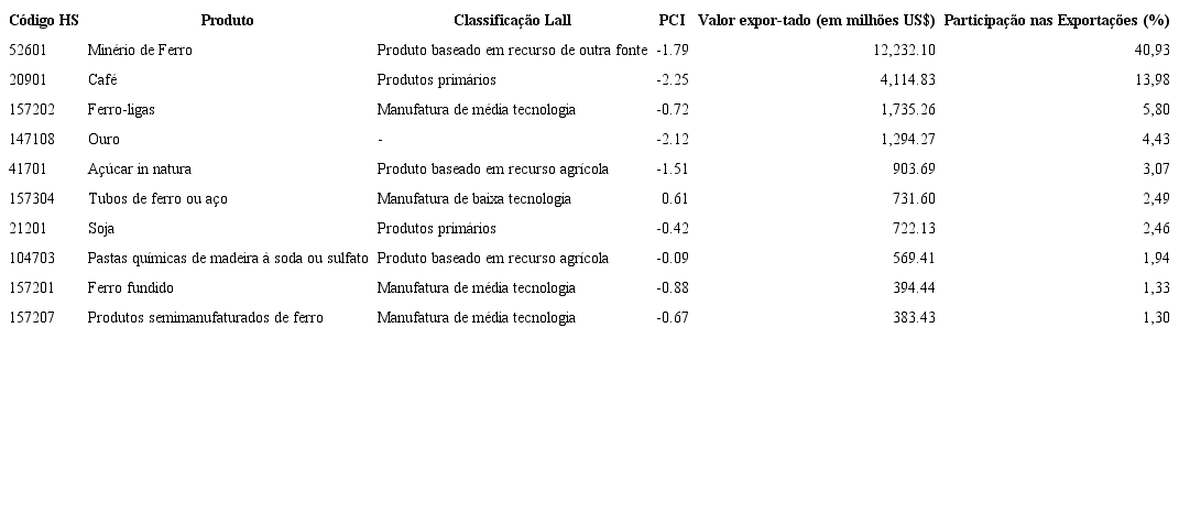 A Tabela 4 apresenta os dez produtos com vantagem comparativa revelada que obtiveram maior participação na pauta de exportação de Minas Gerais em 2014.