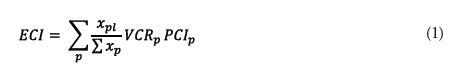 O indicador sugerido pela teoria da complexidade econômica para estimar o crescimento econômico das regiões é o índice de complexidade econômica (ECI), que seria a principal proxy do conhecimento e das capacidades produtivas disponíveis em uma localidade. Esse índice leva em conta os valores do índice de complexidade de produto (PCI)7 dos produtos exportados com vantagem comparativa revelada (VCR), ponderada pelo peso desses produtos nas exportações totais da localidade. Na plataforma Dataviva, o ECI foi adaptado para os estados e municípios brasileiros, sendo calculado a partir da seguinte fórmula, desenvolvida por Freitas e Paiva (2016):