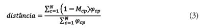 Agregando-se as proximidades é possível calcular a distância entre determinado produto e a estrutura produtiva existente (HAUSMANN; KLINGER, 2007). Dessa forma, a distância é a probabilidade condicional de a localidade exportar um novo produto p, dada sua atual estrutura de exportação. As capacidades que um país possui são capturadas pela proximidade entre os produtos que ele atualmente exporta e o produto de interesse que se quer exportar. Assim, o conceito de distância pode ser utilizado para inferir as capacidades produtivas que faltam ao país estudado a partir da proximidade entre os produtos que o país não exporta e o produto p.