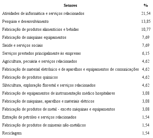 Cerca de 60% das empresas estão localizadas em capitas dos estados brasileiros, 69% têm o mercado nacional como principal e apenas 26% exportam, com a maioria destinando cerca de 1% a 10% das vendas ao mercado exterior. Para identificação do segmento de atividades das empresas, utilizou-se a classificação de “divisão” de acordo com a Classificação Nacional de Atividades Econômicas (CNAE) (Tabela 1). Nas duas primeiras colocações, como esperado, estão setores que podem ser classificados como “intensivos em ciência”, da taxonomia de Pavitt (1984).