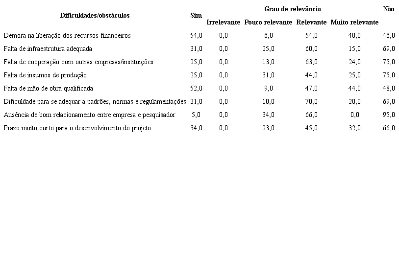 Considerando-se as dificuldades que prejudicaram a implementação do projeto, duas foram destacadas por mais da metade das empresas: a demora na liberalização dos recursos (54% das empresas); e a falta de mão de obra qualificada (52% das entrevistadas) (Tabela 2). Em relação à segunda dificuldade mencionada, tem-se um ponto aparentemente contraditório. Apesar de as empresas possuírem em sua estrutura organizacional profissionais graduados, tal presença não implica que a empresa tenha pessoal com nível de qualificação exigido quando da execução do projeto, o que justifica as respostas a esse quesito.