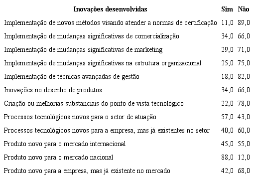 As demais inovações citadas na Tabela 3 apresentaram um percentual abaixo de 35%, porém ainda significativos: implementação de mudanças significativas de comercialização (34%); inovação no desenho dos produtos (34%); implementação de mudanças significativas de marketing (29%); implementação de mudanças significativas na estrutura organizacional (25%); criação ou melhoria substancial do ponto de vista tecnológico (22%); e implementação de técnicas avançadas de gestão (18%).