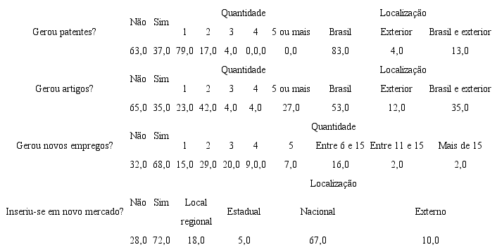 As inovações desenvolvidas a partir do projeto aprovado no Pappe são apresentadas na Tabela 3. A inovação mais significativa está relacionada a um “novo produto para o mercado nacional”, com 88% das empresas introduzindo um novo produto ou serviço de características únicas no país; 45% das firmas afirmaram ter desenvolvido inovações de produto para o mercado internacional. A segunda inovação mais desenvolvida está relacionada a “novos processos tecnológicos para o setor de atuação”, citada por 57% das empresas. Além dessas, destacam-se inovações de produto voltadas para as empresas, mas já existentes no mercado (42%) e inovações de processo já existente no setor de atuação (40%).