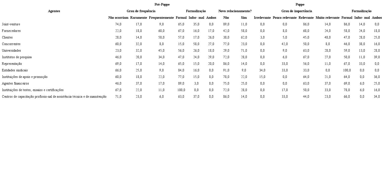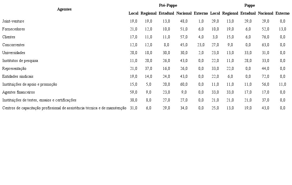 No período pré-Pappe, mais da metade das empresas (58%) mantinham um grau de frequência contínuo em relação ao desenvolvimento de atividades inovativas, enquanto 23% investiam de maneira ocasional e 19% não o faziam. Cerca de 60% das empresas tinham um baixo gasto médio anual com este tipo de atividade, variando de 0 a R$ 80.000,00.11 Em relação à presença de um departamento de P&D, 54% declararam possuir, enquanto 17% utilizavam de uma incubadora, 20% de uma universidade e 9% de um instituto de pesquisa. A aquisição externa de P&D foi considerada um elemento relevante para as atividades inovativas por 57% das empresas, enquanto 43% indicaram ser irrelevante ou pouco relevante. No entanto, não se pode atentar apenas para uma visão de dependência tecnológica, uma vez que compra externa de P&D é um mecanismo capaz de reduzir custos com pesquisa aplicada, visando à promoção de inovações. O grau de absorção de informações tecnológicas foi considerado baixo por apenas 6% das empresas, médio por 53% e alto por 41%.