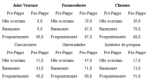 Dentre as novas relações de cooperação criadas, três apresentaram percentual acima de 50% das empresas analisadas: com fornecedores (58%), clientes (62%) e, sobretudo, universidades (71%).