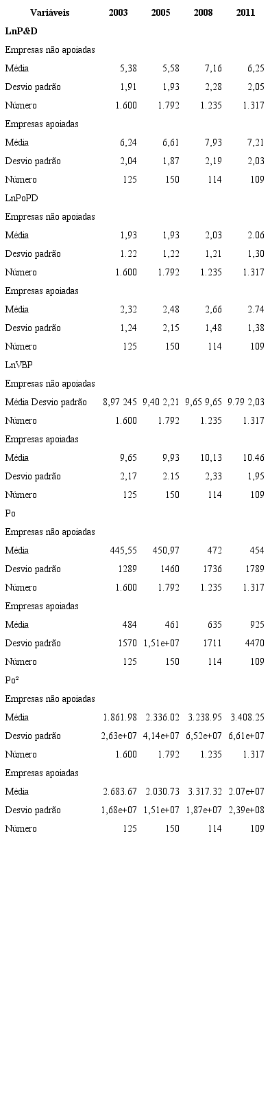 A Tabela 1 demonstra que, em geral, os valores médios mais elevados situam-se em 2008. Já em 2011 os indicadores abaixo mostram que tais valores foram reduzidos em relação ao período anterior. Um importante dado observado em 2008 e 2011 é quanto ao valor médio da variável Po, proxy do tamanho da empresa. Nota-se que a diferença de valores entre as apoiadas e não apoiadas torna-se bem mais expressiva, evidenciando, para as primeiras, maior frequê ncia de empresas maiores. Assim, a maior participação das mesmas coincide com os valores médios mais elevados da intensidade de P&D.