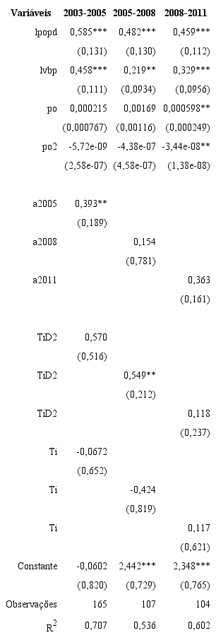 Conforme se observa na Tabela 2, os sinais exibidos pelos parâmetros da variável de interesse (TiD2) são positivos, porém houve significância somente para a estimativa de 2005-2008, evidenciando que, neste caso único, houve adicionalidade. À exceção do volume de mão de obra (Po) nas estimativas de 2003-2005 e 2005-2008, os demais parâmetros das variáveis de controle mostraram significância e são consistentes com o comportamento evidenciado pela literatura, em que uma maior participação relativa da mão de obra especializada em P&D em período integral, assim como o valor bruto da produção, influencia a intensidade de P&D.